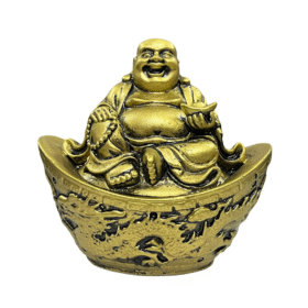 Feng Shui Laughing Buddha | Happy Man Sitting On Ingot (Oxidized Golden) (Height 10 Cms) (1 Pc)