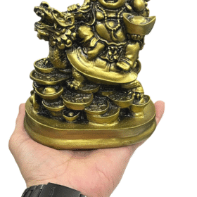 Feng Shui Laughing Buddha | Happy Man Sitting On Lucky Coins & Dragon with Ingot in Hand (Oxidized Golden) (Height12 Cms) (1 Pc)