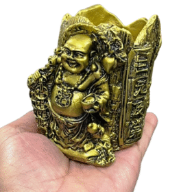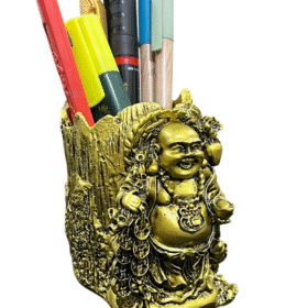 Intricately Detailed Laughing Buddha Pen Stand Crafted In Polyresin With Antique Golden Finish And Traditional Chinese Coin Motifs