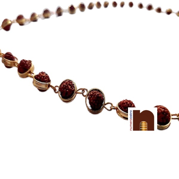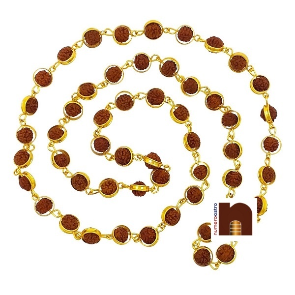 Numeroastro 5 Mukhi Rudraksha Mala With Designer Gold Plated Chain (51 Beads)-This is a new design rudraksha golden chain mala. Every beads fits in the mala circle & the mala is a gold plated for log lasting colour.A Rudraksha with five faces represents Lord Shiva/ Rudra himself. Its name is Kalagni. It is said that it bestows all sorts of salvation & achievement of desired objects. It is said that it also monitors blood pressure & is also used for Japa. Rudraksha mala is said to have many healing properties. Rudraksha is said to be rich with shakti and calms the kundalini, thus making it easier to rise. Rudraksha is said to open the heart chakra. They are good for meditation and protection. Legend says that Siva awoke after a thousand years of meditation and began to shed tears of worldly compassion. These tears crystallized into seeds and there grew the first Rudraksha tree.