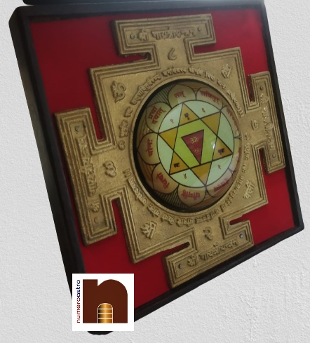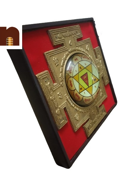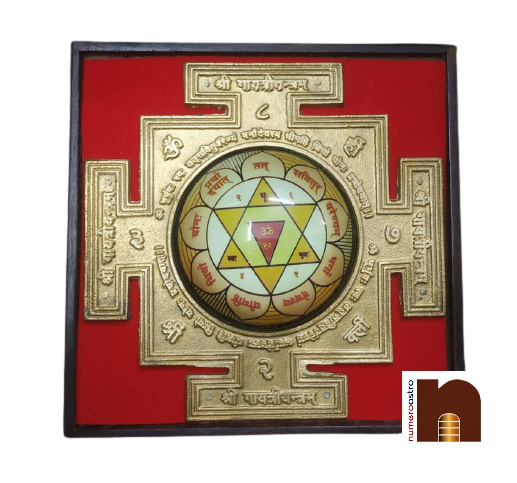 Numeroastro Shri Gayatri Yantra In Brass With Wooden Frame (1 Pc) (16 Cms)-It sharpens intellect, enhances knowledge and eradicates sins. Sacred texts says, “The Gayatri is Brahma, Gayatri is Vishnu, Gayatri is Shiva, the Gayatri is Vedas”. Gayatri later came to be personified as a Goddess. She is believed to have five heads and is usually seated within a lotus. The four heads of Gayatri represent the four Vedas and the fifth one represents almighty God. Her yantra is a highly recommended for gaining spiritual power & peace of mind. Gayatri Devi is Maha Devi and the deity of the Gayatri Yantra. The Yantra contains Panchmukhi or Ashat Mukhi. This Yantra can be installed in the home or business premises. With sincere devotion, one cannot be affected by other-worldly souls and spirits and is blessed with health, wealth and happiness. In cases when a home or person is afflicted by discarnate souls and spirits, after puja of the Gayatri Yantra, it can be dipped in water for sprinkling around the home for one week to banish all unwelcome spirits. The afflicted person should consume rice, milk and water during puja days. A ghee lamp should be lit continuously all day and night away from open doors, windows and flammable materials. Mantra:- Om Bhu, Bhuvah, Swah Tat Savitur Verenyam Bhargo Devasya Dhimahi Dhiyo Yor Prachodayat First purify your body and start with a clear and positive mind frame Find a place on the floor facing east, where you will be undisturbed. Light the incense or diya. (It does not matter how many you light). Lay a fresh flower and a fresh fruit on the altar. Open the Yantra and place it along with the image of the deity of yantra and your isht God. Take the water with any leaf from any tree and sprinkle the water on yourself followed by sprinkling the water on the Yantra. Then purify your soul and surrender yourself completely in devotion to God and chant 21 times the mantra. Close your eyes and concentrate on the deity to bless you with wishes.