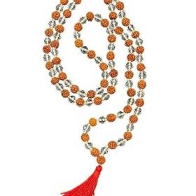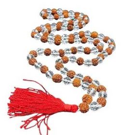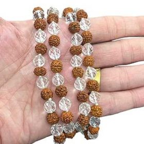 Rudraksha Sphatik | Crystal Diamond Cut Beads Hand Knotted Mala For Men & Women (109 Beads)- This hand-knotted mala makes for a thoughtful gift or personal spiritual practice. Crafted from 109 rudraksha and crystal beads, it creates a focal point for meditation and mantra recitation. The combination of rudraksha and clear quartz gemstones provides a calming energy said to boost concentration and clarity. Measuring approximately 27 inches in length, it comfortably fits around the neck and lays flat without tangling. Made by skilled artisans, each bead is meticulously knotted between strands for durability. Both stylish and meaningful, this mala can be worn daily as a reminder of your goals and higher purpose.