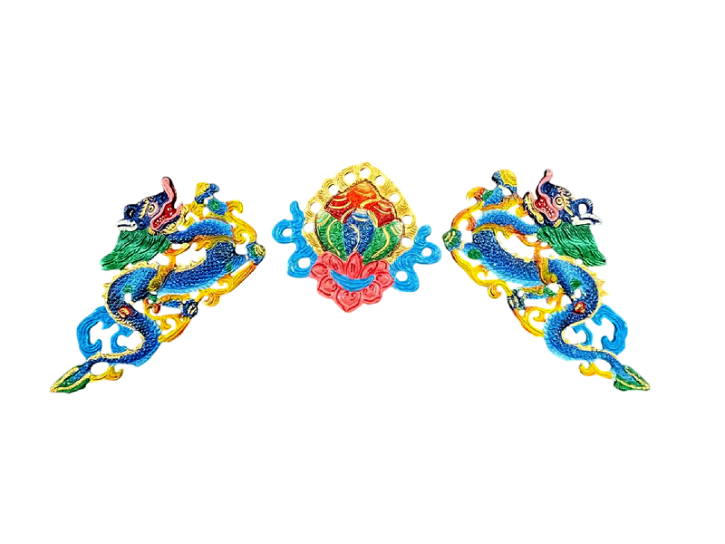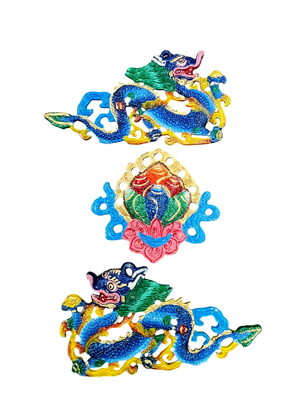numeroastro Tibetan Budhist Norbu With Two Dragons Of Fortune In Aluminium Wall Hanging (Blue) (1Set)- Bring auspicious energy and cultural richness to your living space with this striking Tibetan Buddhist wall hanging. The masterfully crafted aluminium piece features the sacred Norbu symbol at its centre, flanked by two majestic dragons of fortune. The vibrant colour palette includes emerald green dragons with intricate scale details, accented by royal blue waves, golden flourishes, and coral-red lotus motifs. This traditional design symbolises protection, prosperity, and spiritual enlightenment in Tibetan Buddhism. The detailed metalwork showcases fine craftsmanship with dimensional effects that create an eye-catching interplay of light and shadow. Perfect for meditation rooms, living areas, or any space where you wish to incorporate meaningful Buddhist artistry. The durable aluminium construction ensures long-lasting beauty while being lightweight enough for secure wall mounting. This decorative piece adds both cultural significance and artistic appeal to your home décor.