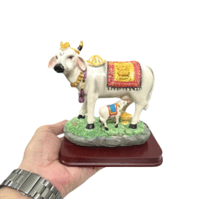 Suitable For Use During Religious Ceremonies And Pujas, Adding A Touch Of Divinity. This Resin Sculpture Depicts A Mother Cow With Her Calf, Making It An Elegant Home Decor Piece.